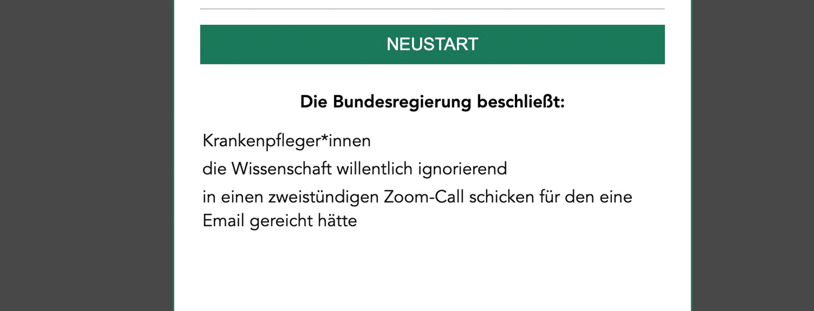 "Schulen alle zwei Wochen mit Trockenhefe versorgen"? Solche und weitere irrsinnige Beschlüsse generiert der Maßnahmengenerator. Als Satire auf die deutsche Corona-Politik ging die Webseite in wenigen Stunden viral und war sogar in den deutschen Top 3 Twitter Trends. Die Zeit, t3n und ntv haben online berichtet. #maßnahmengenerator