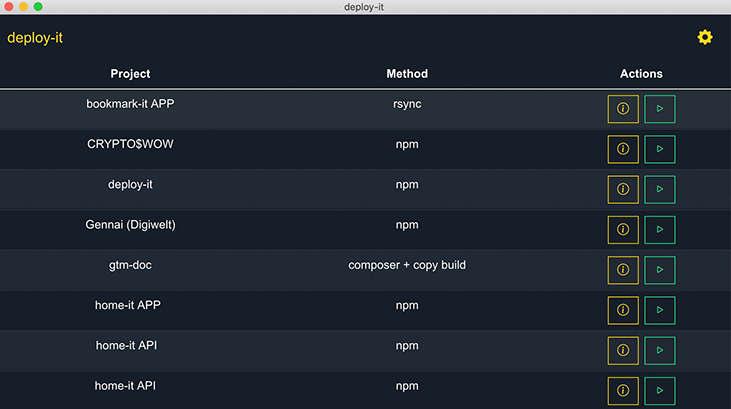 Diese electron-vue Anwendung ist für den reinen lokalen Nutzen konzipiert und erleichtert die Handhabung von Deployments auf entfernte Server. Über eine zentral gepflegte JSON Datei, kann die Liste der Projekte und deren Deploy-Befehlen dynamisch erstellt werden. Die Benutzer_Innen werden mit Hilfe von Farben und Icons über den aktuellen Status ihres Deployments informiert.