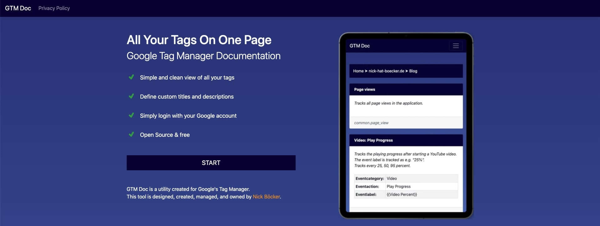 Obwohl der Google Tag Manager damit wirbt auch für Nicht-Entwickler_Innen leicht verständlich zu sein, so bedarf es doch einer gewissen Einarbeitungszeit, bis man das Interface und die Zusammenhänge versteht. Diese Zeit kann und will aber nicht immer investiert werden. Deshalb habe ich GTM Doc entwickelt. Webseite aufrufen, in Google einloggen und Container auswählen - fertig!