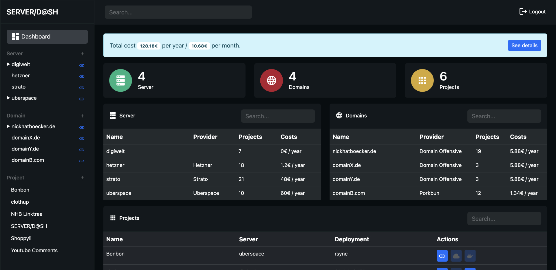 Nachdem ich mich mehr mit dem Thema DevOps auseinandergesetzt habe und eine eigene virtuelle Serverlandschaft konfiguriert habe, wollte ich eine Monitoring-Lösung entwickeln. Server/D@sh ist eine Web-App, die es ermöglicht, Server, Domains und Dienste zu überwachen. Die App nutzt Vue3 als Framework und eine Appwrite Datenbank, die über eine REST-Schnittstelle angesprochen wird.