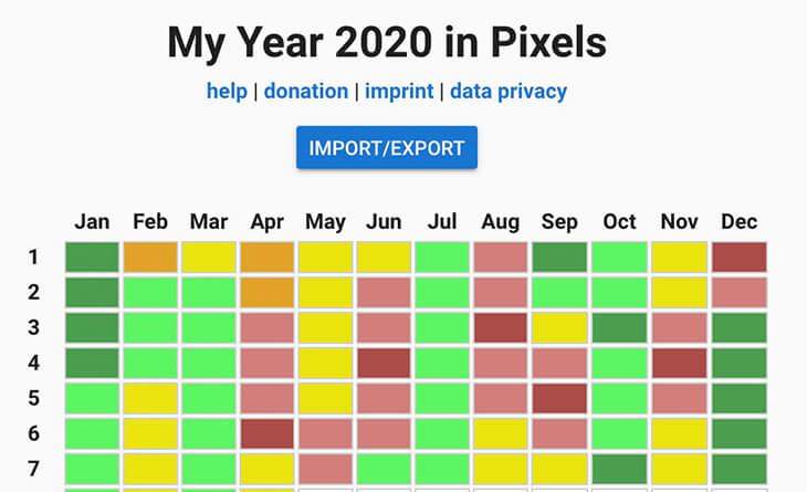 Das Konzept „My Year in Pixels“ wurde von der Userin Camille (@passioncarnets) entworfen. Dabei notiert man pro Monat für jeden Tag ein Kästchen und füllt dieses mit einer Farbe. Am Ende des Jahres hat man so eine Übersicht, wie man sich über das Jahr weg gefühlt hat. Diese App basiert auf VueJS und speichert die Kästcheninhalte in den Local Storage.